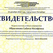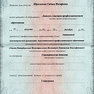 2019 г. — Клиническая ординатура по специальности ортодонтия на базе Института стоматологии последипломного образования г. Санкт-Петербург. Под руководством доктора медицинских наук, профессора, заведующего кафедрой ортодонтии Фадеева Романа Александровича.